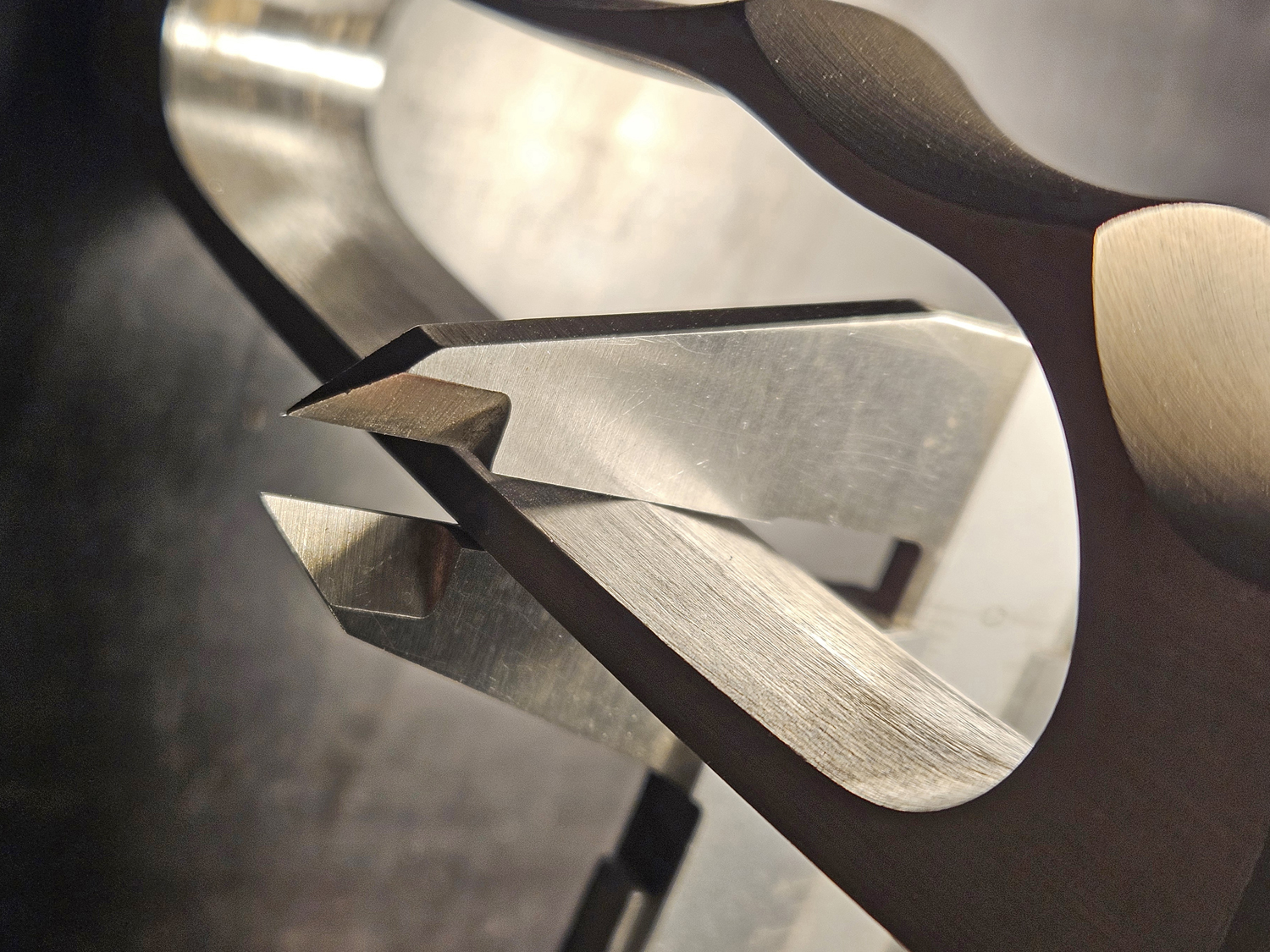 Aus einem Stahlblock wie ganz oben von 14 bis 18 mm Stärke mit immer subtileren Arbeitstechniken das darin enthaltene Messer wie ein Bildhauer in einem Stück herauszuschälen, bedeutet stets eine neue Herausforderung. Vorbereitend verwende ich selbstverständlich eine handgesteuerte Fräsmaschine und eine Metallbandsäge. Danach führe ich mit einem Handarbeitsanteil von cirka 90 % mein in langen Praxisjahren ausgeklügeltes Schleifprozedere in Verbindung mit viel Feilarbeit - oder wie hier oder hier - immer wieder unterbrochen durch kritischstes Prüfen von Parallelität und Symmetrie sowohl auf einem Messtisch als auch mit geschultem Augenmaß - durch. Das ist in der Gesamtschau sehr arbeitsaufwändig und beinahe in jedem Stadium wahrlich anstrengend. |