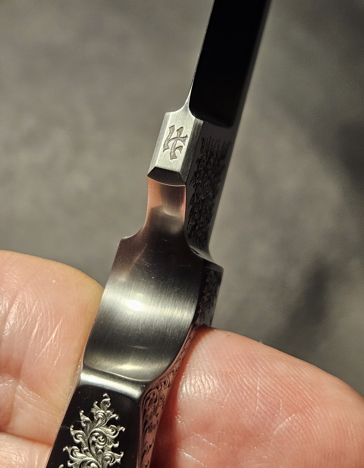 Die zwei unteren Fotos zeigen eine spezielle Ausführung für begeisterungsfähige Damen mit Voll-Gravur, Griffeinlagen aus rotem Mammut-Backenzahn und farblich passendem Ganzschliff-Perlrochen-Mäntelchen als Tasche ohne Gürtelschlaufe mit Titan-Verschlussknopf. "Feines Englisch" steht ihm gut! |