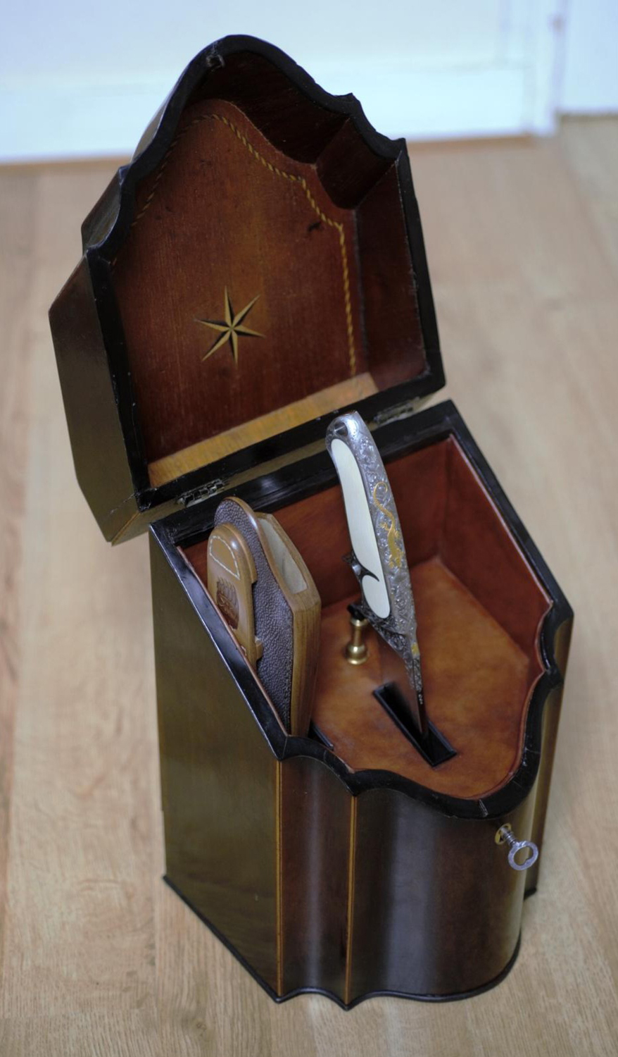 Voll-Integral Kal. 100-45 stabilisierter Giraffenknochen, senkrechter Knaufdurchbruch, spezielle straußenbeinlederbezogene Steckscheide. |