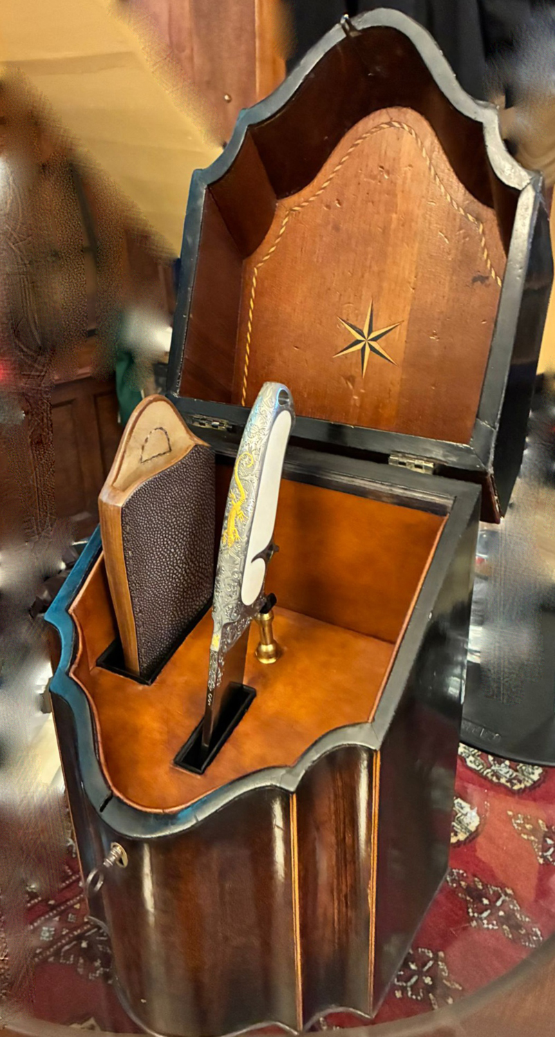 | Kleinere Variante Modell Wanderfalk in Kal. 165-80 mit Cocobolo-Holz und rochenlederbezogener Gürteltasche. |